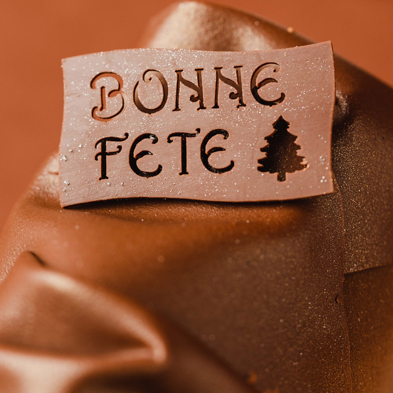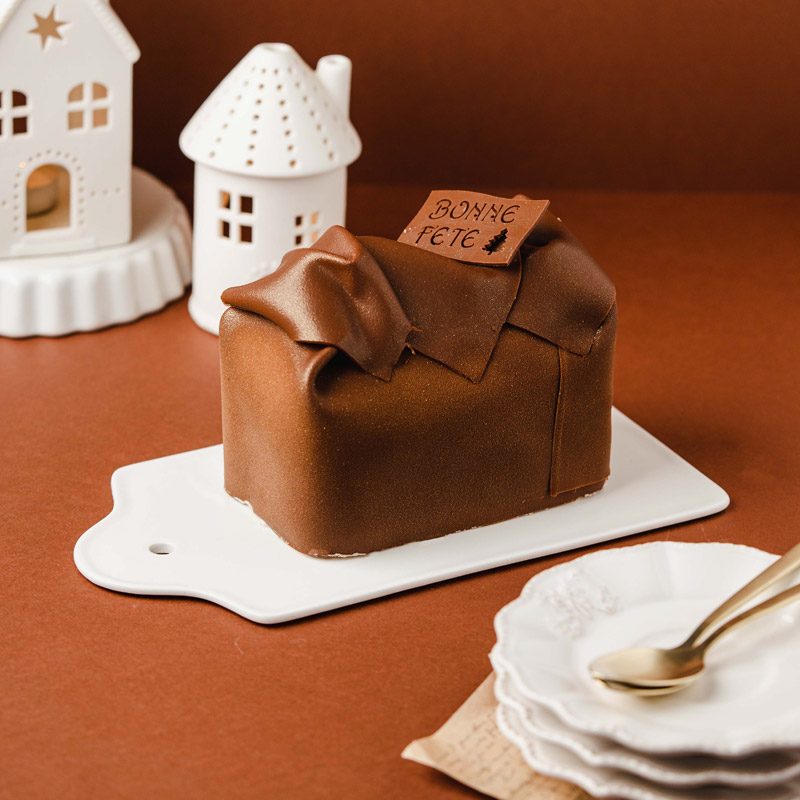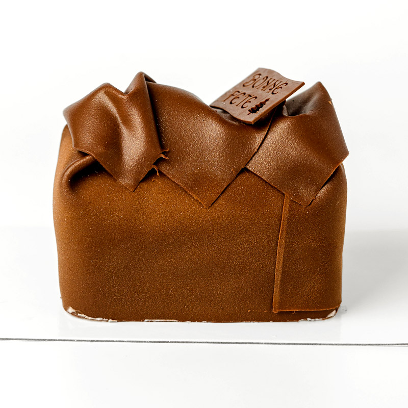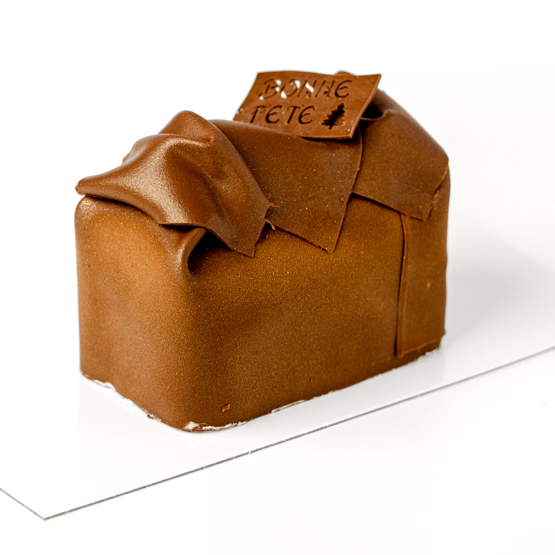Recouverte de chocolat Hukambi 53 %, mousse à la crème fraîche, couches de chocolat Genovese et mousse au chocolat mi-noir Équatorial 55 %.